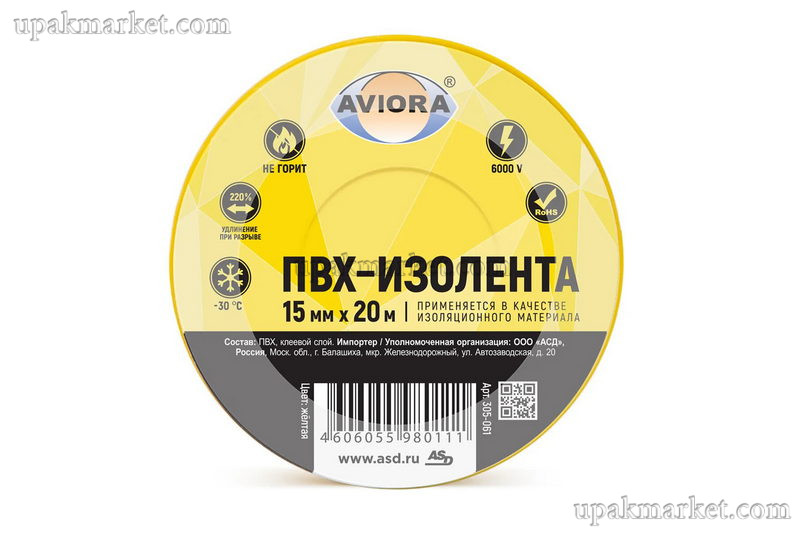 Изолента ПВХ 15мм х 20м желтая AVIORA