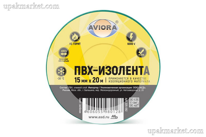 Изолента ПВХ 15мм х 20м зеленая AVIORA