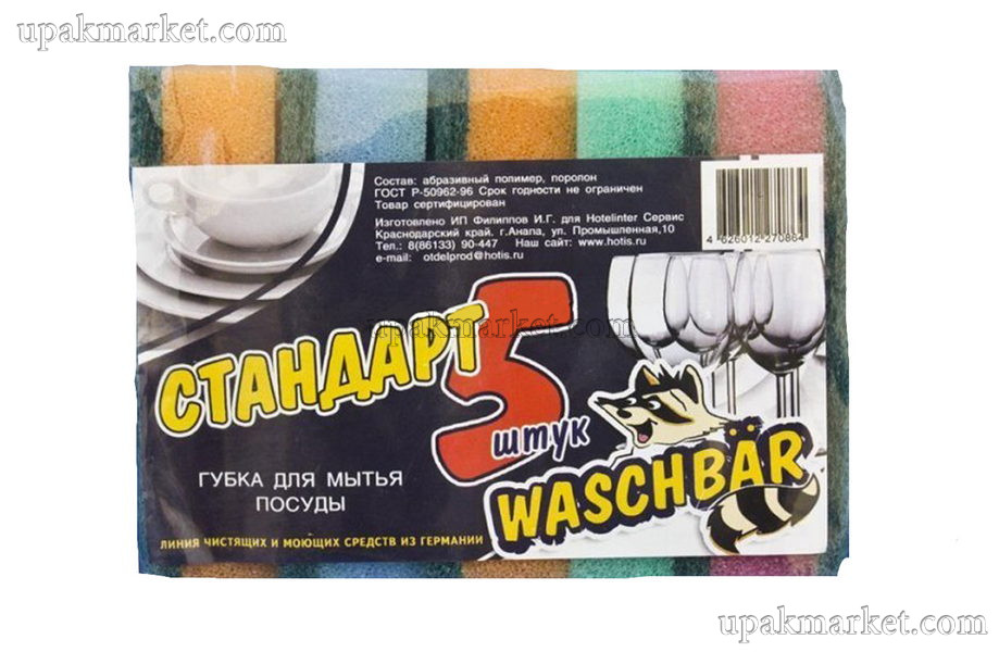 Губка для посуды 90х60х25мм "Стандарт-5" WASCHBAR предлагается в упаковках по 40 штук. Эти губки предназначены для эффективного мытья посуды и идеально подходят для ежедневного использования.