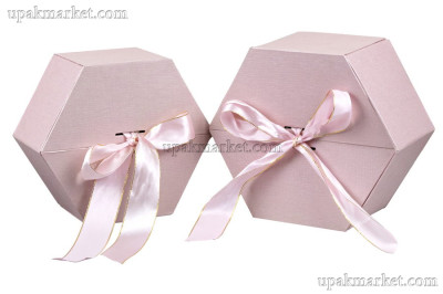 230*230*130мм, 3 цвета (розовый, серый, черный), подарочная коробка в виде шестигранника, тканевое покрытие, на дне выдвижная подставка, атласный бант.