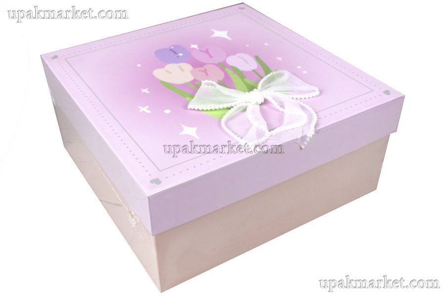 240*240*115мм, нежно розовый цвет с рисунком (тюльпаны) и сетчатым бантиком.