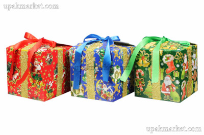 130*130*130мм, Сборная новогодняя коробочка, три ярких расцветки с блестками и атласными лентами.