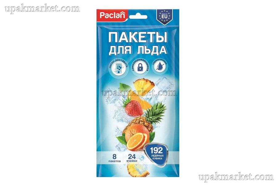 Пакеты для льда с клапаном 192 кубиков (8 пакетов в упаковке) PACLAN в мягкой упаковке предназначены для быстрого и удобного приготовления льда. Идеально подходят для замораживания воды, соков и морсов; водных составов для косметических процедур; холодных компрессов.