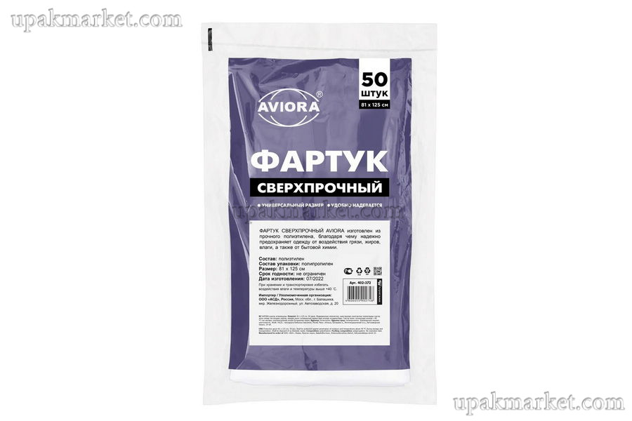 Сверхпрочный фартук AVIORA изготовлен из прочного полиэтилена, благодаря чему надёжно защищает одежду от воздействия грязи, влаги, жиров, бытовой химии, лакокрасочных материалов.