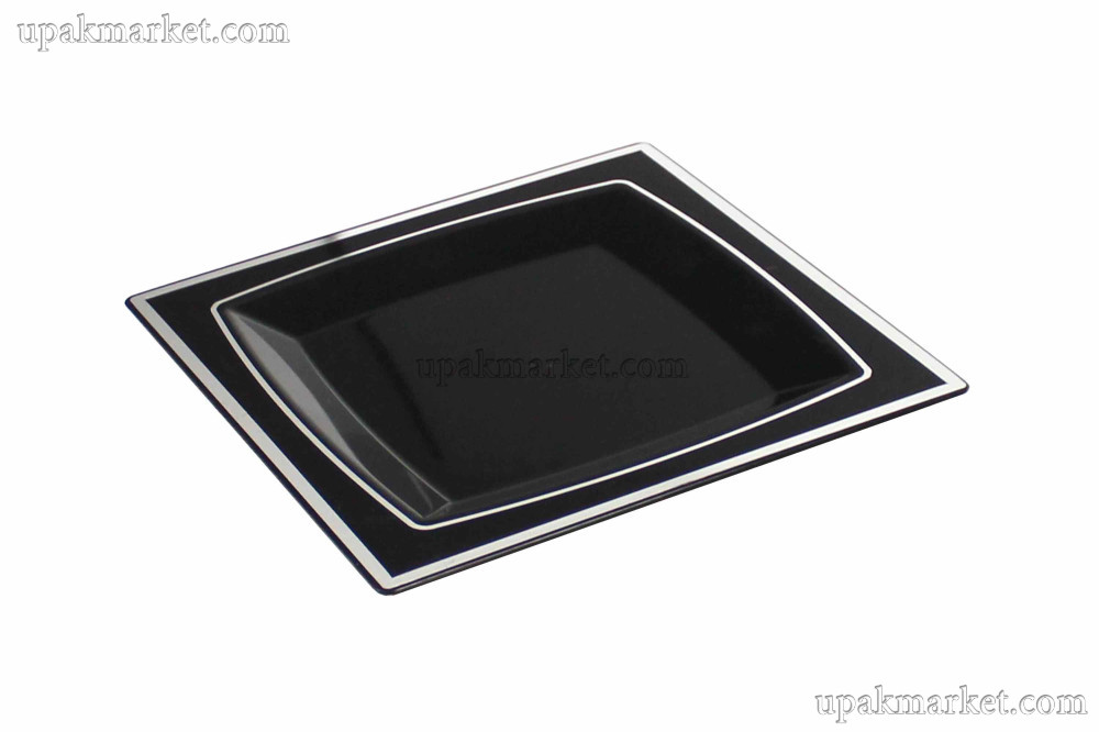 Тарелка пластиковая 240х240мм ПС Квадратная черная с серебряной каймой /12уп х 10шт/ очень лёгкие и удобные в использовании.