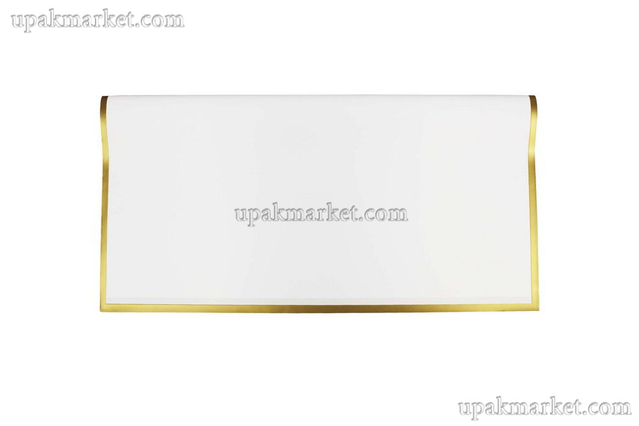 Пленка 57х57 матовая белая, золотой кант /5уп х 20л/ может быть использована для упаковки букетов, корзин с цветами, подарков в коробках или пакетах. Она защищает содержимое от повреждений, пыли и влаги, а также создаёт привлекательный внешний вид упаковки.